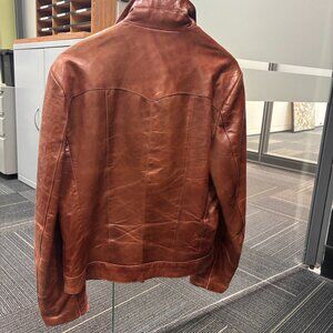 This timeless bomber-style jacket is crafted from rich cognac-colored leather, offering a warm, versatile tone that pairs beautifully with any wardrobe. The leather is slightly broken in, giving it that perfect vintage character, with only minor signs of wear at the sleeve edges and a small, barely noticeable spot under the right forearm.
