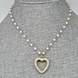 Vintage Aurora Borealis AB Rhinestone and faux pearl necklace. Features a reversible heart pendant with gold-tone hardware. Chain is faux pearls with a mix of silver and gold-tone. Measures about 16" at full length. Adjustable length with hook back close. Purchased from an estate and no visible maker's mark. Excellent condition and smoke-free home.