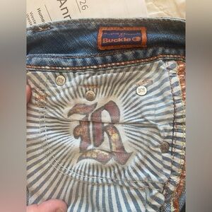 Blue denim with detailed white stitching. Features Rock Revival label and beautiful artwork patches.