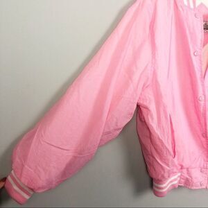 Adorable bubblegum pink vintage jacket with white stripes at the collar and cuffs. Rock & Roll on the back. Has a few spots like the ones shown but nothing too noticeable. Fits like a Junior size Medium.