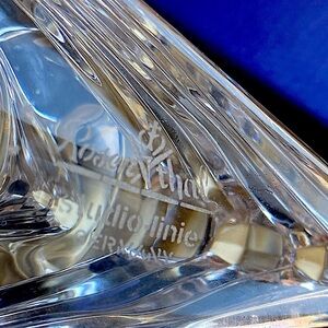 Beautiful vintage Rosenthal Germany clear cut crystal candleholder. This neat fanned Art Deco candleholder is perfect for the 80s lover! Makes an awesome catchall dish too. The crystal is about 24% lead (would not recommended for food safe). Logo Engraved at the bottom.
