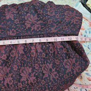 This is a gorgeous, vintage S. Howard Hirsh lace dress. Great vintage condition. Black color with burgundy lace. Satin-lined. Bell sleeves. There is a safety pin in the back by the zipper. Doesn't seem to be holding anything together and the zipper works perfectly. Dress does not state the size, but it seems like a small to me. I have taken a few measurements (see pics). Please message me if you'd like more measurements. Necklace not included