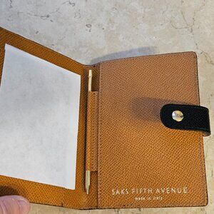 This is for an AUTHENTIC Sak's 5th Avenue Italian Leather Mini Notebook. It was purchased MANY years ago from Saks in Texas. It is made of black and tan Italian leather. It is a pebbled leather. It measures approximately 4 7/8"L (from top to bottom) by 3 1/2"W (when closed...not including snap closure) by 7 1/8"W (when opened...not including snap closure.) Inside is marked, "SAKS FIFTH AVENUE Made in Italy." Comes from a non-smoking home. It is in EXCELLENT condition. Pictures of actual item.