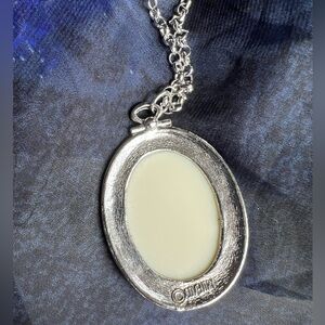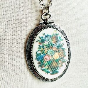VINTAGE SARAH COVENTRY pendant necklace Silver tone chain Floral cabochon