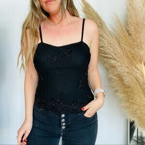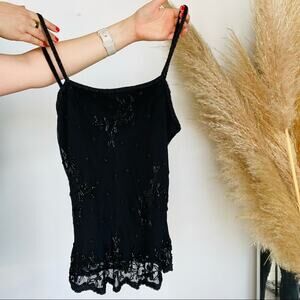 VINTAGE SCALA Black Embellished Floral Sequin Bead Beaded Tank Top Silk Cami S