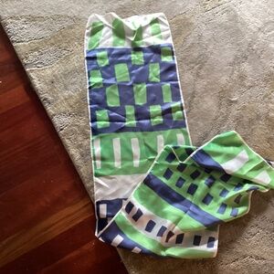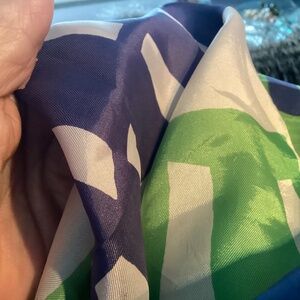 is a vintage item. Itโs in the greens and blues that lovely granny apple green that we all used to love to wear so much back in the day. It has some splashes of white as well. The scarf looks to me to be an acetate blend Iโm not positive. Thereโs no tag left so please go by the description it measures approximately 50 inches long and the width and it is approximately 11 inches just the prettiest colors that mid-century vibe from back in the 5060s and 70s never ever goes out of style. Have fun no smokers no PET home.