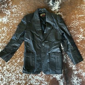 In good condition. Black seal leather. Has inside pockets. Missing button, bit comes with replacements located inside. See photos. Marked size L. Would say this fits a modern day M or S. Has beautiful western details.