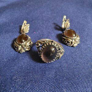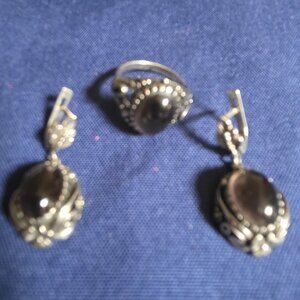 VINTAGE RUSSIAN RING AND EARRINGS SET IN LOW GRADE SILVER METAL WITH ATTRACTIVE MOONSTONE LIKE OVAL CABOCHAN STONES. NICE FILAGREED SETTINGS OF RING , APPROXIMATE SIZE 8, AND EARRINGS. ORIGINAL DESIGN FOR UNUSUAL GIFT.