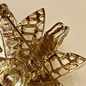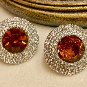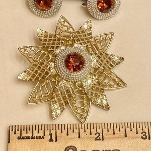 VINTAGE SIGNED CATHE BROOCH/PENDANT AND EARRINGS SET, SILVER AND GOLD, RHINESTONE AMBER CENTER
