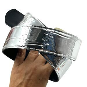 Up for sale, a very nice vintage silver foil metallic belt. It is in very good preowned condition. It is marked a size M-L, but check the measurements, it seems to run on the small side.