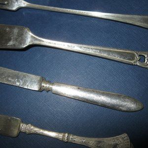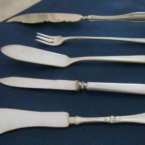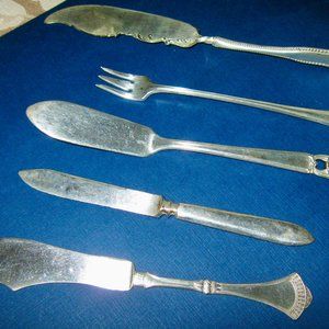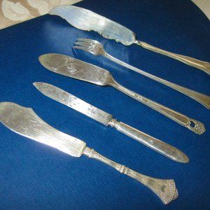 "ASSORTED SILVER PLATE SERVING PIECES (5)”... These unusual pieces have been with us "forever". We cleaned them but never seem to have occasion to use them The fancy knife with twisted handle is signed Rogers AA. The next serving knife is signed Tilden Thurber Co. on the blade. The other fancy handled knife is monogrammed M E A and signed o the blade with IV 1847 RB A1 (not sure what that means but is a really pretty handle (probably used as a butter knife). The last butter spreader has an interesting handle as well and is signed 1847 Rogers Bros. as well as IS and "Especially yours. The last item a pastry fork or pickle fork or lobster fork is signed G.H. Allen & Co. Any questions, please contact the seller through eBay email. These will ship together carefully wrapped and hopefully you can get them replated and use for many years to come! These are all in fairly good condition so replating them may not be desirable. This is a great time to buy and add to your entertaining. We will ship with lots of packaging to avoid damage. They all measure between 6" and 7". Make your next luncheon or dinner party sing with these.