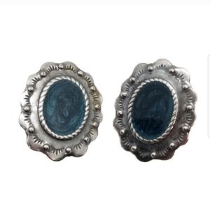 Beautiful vintage western style silver plated steel with blue shimmery enamel detail clip on earrings. Earrings measure 1-3/8 inches in length and 1-1/8 inches wide. Unique earrings in great condition.