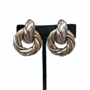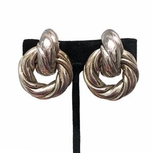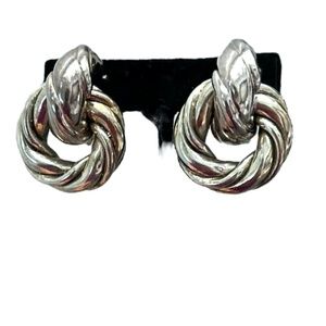 Vintage silver tone puffy twist huggie with circle drop clip on earrings in very good preowned condition. They are designed to have darkened areas at the indentations. Hollow and lightweight. 1 1/2"L x 1 1/4"W.