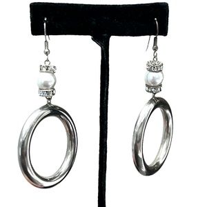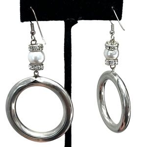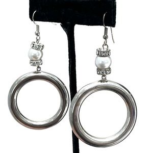 Vintage shiny silver tone tube circle dangle earrings. The circle is 1 5/8" diameter and 1/4" wide. Atop the circle is a pearl (I assume it's not real, but I don't know for certain) set between 2 rondelles with clear crystals. The pearl is 10mm diameter. There are some scratches and minor discoloration on the silver part due to age and wear. Not really noticeable when worn. See photos. In good preowned condition.