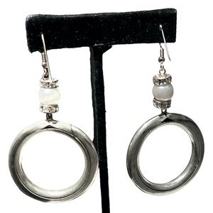 VINTAGE SILVER TONE TUBE CIRCLE DANGLE EARRINGS WITH PEARL AND CRYSTAL RONDELLES