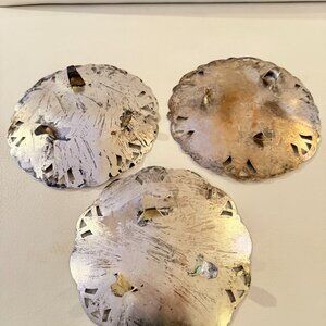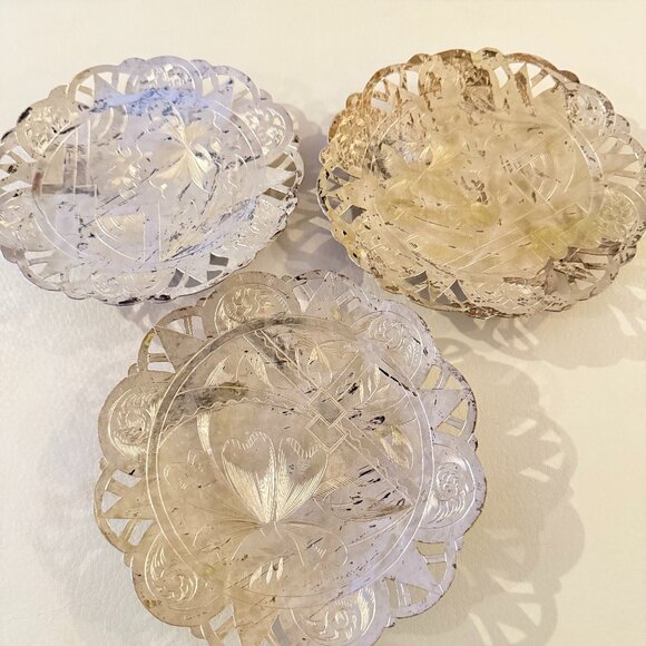 Set of three vintage silver-tone metal footed dishes. Each dish features a pierced scalloped rim with engraved floral and leaf design in the center. The backs have small integrated feet, allowing them to sit slightly elevated on a table or surface.