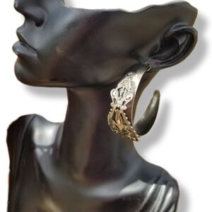 Lovely vintage hoop style earrings made of silver plated steel with ornate design detail on outside. Earrings measure 1-7/8 inches tall and have a 5 inch circumference around outside of earrings. Earrings have stud backs and are in good condition.