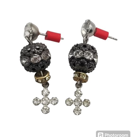 Lovely little vintage drop style earrings featuring silvertoned filligree designed balls with glass crystal crosses. Earrings are lightweight and measure 1-1/2 inches tall with stud style backs.