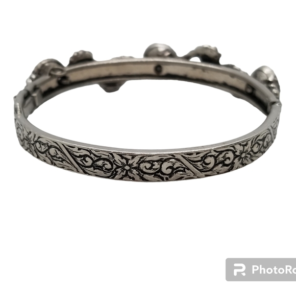 Beautiful vintage silvertoned bracelet with rope design detail and beautiful faceted blue and gold aurora borealis crystal.There are three blue and gold ab crystals and three solid light blue Austrian crystals. This piece also has beautiful floral designs embossed on back half of bracelet going around it. Bracelet measures 6-1/2 inches around inside of bracelet and opens on a hinge. Bracelet is in good condition but does have some damage to one of the stones where the surface has chipped, this can be seen in last pic.