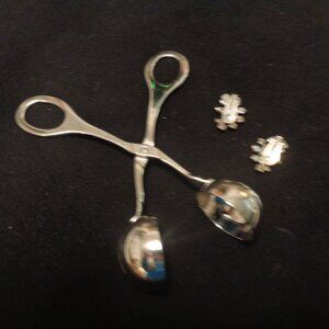VINTAGE SILVERTONE MODERNIST SCOOP TONGS & CLIPBACK SCANDI EARINGS LOT. THIS IS SUCH A GREAT LITTLE LOT. WE DO NOT BREAK UP LOTS NOR BUNDLES. ALL ITEMS ARE VINTAGE. #1 THE SCOOP TONGS ARE STAINLESS STEEL WITH SOME WEAR. #2 THE SCANDI EARINGS ARE CLIPBACKS NOT MARKED. ENJOY THE GOODIES. VINTAGE SILVERTONE MODERNIST SCOOP TONGS & CLIPBACK SCANDI EARINGS LOT. 4TH GROUP. #427. THANKS