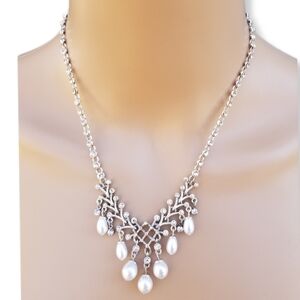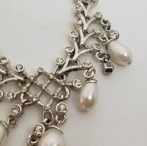 VINTAGE SILVERTONED NECKLACE WITH FAUX DROP PEARLS & GLASS RHINESTONE ACCENTS