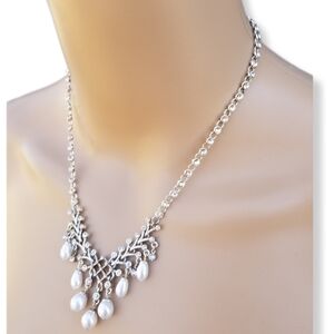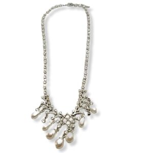 Beautiful silvertone chain style necklace with faux drop pearls and glass rhinestones. Necklace measures 17-3/4 inches total length. Excellent condition