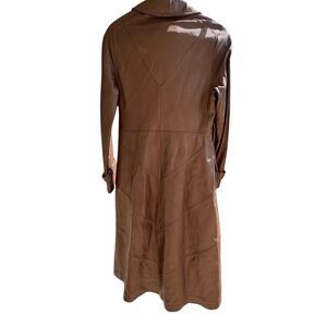 Step into timeless sophistication with this vintage Skin Gear full-length brown leather trench coat. Crafted in Mexico, this coat features structured seams, a classic notched collar, five-button closure, and adjustable wrist straps. The fully lined interior offers comfort and warmth while maintaining a sleek silhouette.