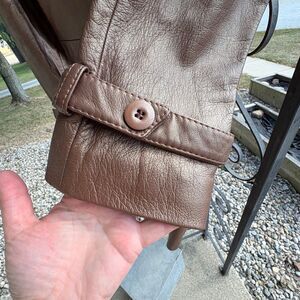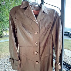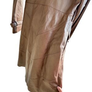 Condition: Excellent vintage condition — soft, supple leather with full button front, detailed panel stitching, and belted cuffs. Lining clean and intact. No rips, stains, or odors. Maybe just a small blemish on back, shown in picture