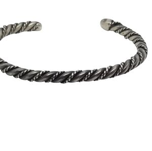 Vintage sterling silver cuff style bracelet. Bracelet is solid and has a beautiful twisted rope design. Bracelet measures 5-1/4 inches around inside from one end to the other and weighs 16.7 grams. Patina on bracelet can be removed upon request.