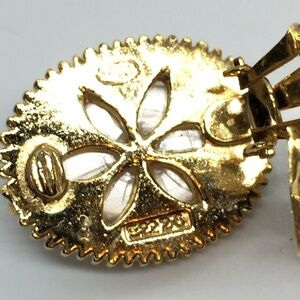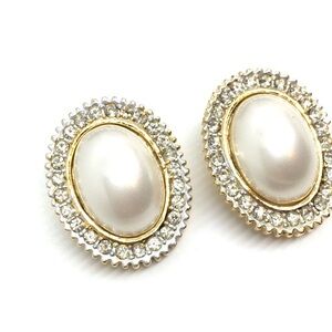 VINTAGE SPHINX PEARL RHINESTONE GOLD TONE OVAL LARGE CLIP ON STATEMENT EARRINGS
