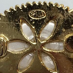 Elegant vintage Sphinx clip-on earrings featuring luminous faux pearls surrounded by a dazzling rhinestone border in a classic gold-tone setting. These stunning statement earrings are perfect for adding a touch of glamour to any outfit. Signed “Sphinx” on the back.