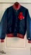 —Navy, satin body with red, quilted lining. Red, navy, and white striped cuffs around wrists and waist.
