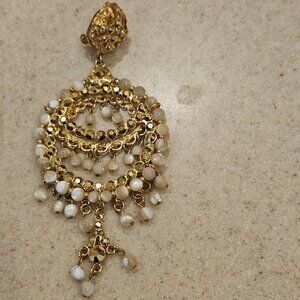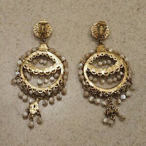 This is AUTHENTIC Jose & Maria Barrera Earrings. These lovely HAUTE COUTURE earrings are done in a yellow gold plate metal. GORGEOUS beige-ish gold and ivory colored stones accent these earrings and yellow gold plated Swarovski crystals. GORGEOUS flower design at top, which attaches to a round design. Both backs are marked, "Barrera." Handmade in the U.S.A. These are pre-owned. There is one dangling stone missing and one yellow gold-plated crystal missing...see pictures. These are from Neiman Marcus and is not the cheap Barrera from Avon. I purchased these from Neiman Marcus many years ago!! These measure 3 7/8" L by 1 3/4"W (at widest part.) The top portion measures 5/8"W (at widest part.) These come from a non-smoking home. Pictures of actual item.
