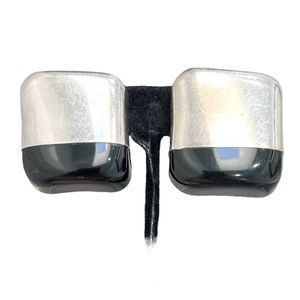 Vintage sterling silver and black clip on earrings. There are some scratches on the silver from wear. The black part of the earring is the bottom when worn. It may be enamel, but I'm not sure of the material. See pictures. In very good preowned condition.