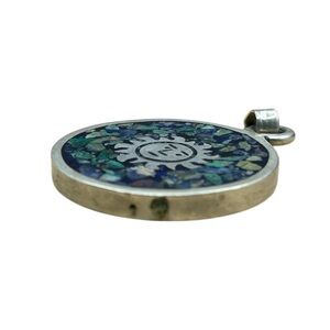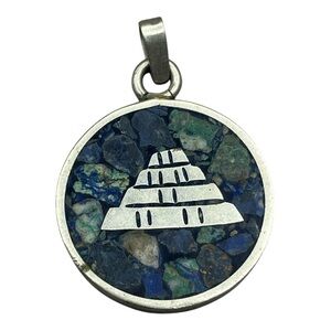 Beautiful double sided pressed turquoise sterling silver pendant. One side features a sun and the other a Mayan or Aztec temple.