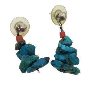 Lovely vintage drop style earrings made with sterling silver and nuggets of raw blue/ green turquoise stone. Earrings measure 1-1/2 inches tall. Great condition.