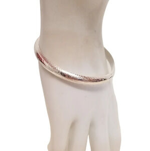 Beautiful vintage sterling silver bracelet with decorative etched designs all around bracelet. Bracelet opens on a hinge and has an additional safety chain. Bracelet is hollow on the inside and weighs 8.4 grams. Bracelet measures 7-1/4 inches around inside and is 1/4 inch wide. Bracelet stamped 925 on the inside, excellent condition
