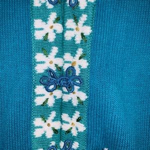 ❤️ VINTAGE SWEATER INSPIRED BY THE ORIENTAL CULTURES THIS BEAUTIFUL TEAL & GREEN COLORED STORYBOOK KNIT CARDIGAN IS A TRIBUTE TO THE MAGICAL CRANES❣️FLOWERS ACCENT THE SWEATER AND BRIGHT BLUE SCROLL HOOKS ADORE THE SWEATER DOWN THE FROM. HAS GOLD THREAD TO ACCENT THE CRANES AND A COUPLE OTHER PLACES. ITS AN ABSOLUTE GORGEOUS SWEATER WITH THESE GLORIOUS CRANES BEING THE CENTERPIECE❣️