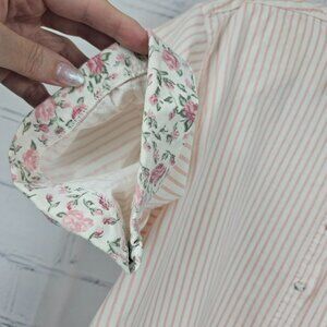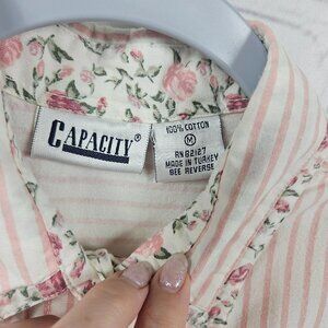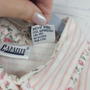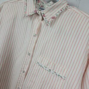 VINTAGE STRIPED FLORAL BLOUSE SHIRT TOP Womens M Cotton Shoulder Pads Pastel