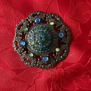 Vintage round black Brooch with Rhinestones. Unmarked. INVENTORY TOTE L