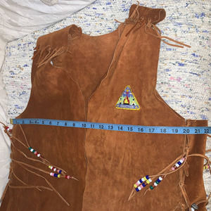 HIPPIE BOHO SUEDE VEST WITH BEADED FRINGE AND A VINTAGE PATCH. COULD EVEN BE WORN WRAPPED AS A TOP WITH A BELT. MEASUREMENTS IN PHOTOS. ONE TIE MISSING AT SHOULDER (SEE PHOTO)- EASILY REPLACED