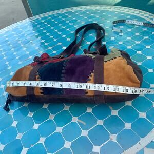 VINTAGE SUEDE BAG WITH MULTICOLOR PATCHES OF GENUINE SUEDE OUTLINED BY WHIPSTITCHING. DOUBLE HANDLES FIT OVER SHOULDER. BACK IS SOLID BROWN. MEASUREMENTS IN PHOTOS. EXCELLENT CONDITION. DRAWSTRING AND SNAP CLOSURE.