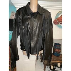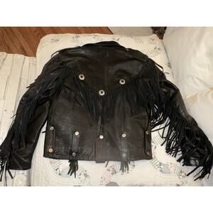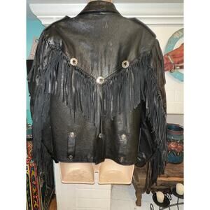 THIS IS A 70's-80's HEAVY (5 LBS) LEATHER JACKET WITH QUILTED LINING. HEAVIEST LEATHER JACKET I HAVE EVER SEEN! DECORATED WITH FRINGE AND CONCHOS. THE LABELS ARE NOT REALLY READABLE DUE TO AGE BUT MEASUREMENTS ARE IN PHOTOS.