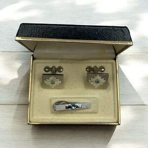 VINTAGE SWANK SILVER/BLUE RHINESTONE CUFF LINKS AND TIE BAR - NIB