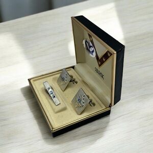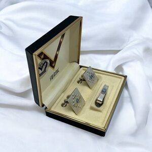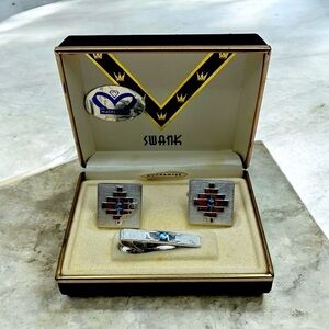 Add a touch of sophistication to your formal attire with these vintage Swank cufflinks and tie bar. The silver-tone metal and light blue rhinestone center make for a stylish combination that complements any outfit. The brand Swank is synonymous with quality, and these cufflinks are no exception. Crafted with attention to detail, the cufflinks and tie bar are perfect for any occasion. The blue glass stone adds a pop of color to the silver-tone metal, making them a great addition to your jewelry collection. Whether you're looking to enhance your style or simply want to add a touch of elegance to your wardrobe, these cufflinks and tie bar are a must-have.