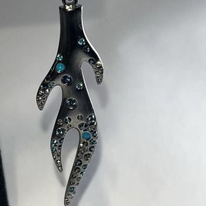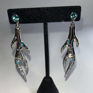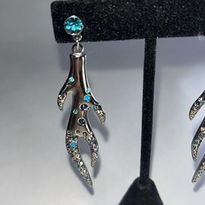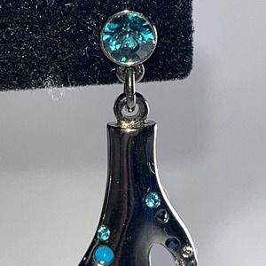 This is a pair of STUNNING SWAROVSKI signed earrings, both on earring backs and back of earrings themselves. Done in deep rich hematite metal, and featuring an array of blue and smoky crystals set in these dagger-like earrings! They measure 2 3/4 inches in length and are in EXCELLENT condition! They are beautiful!