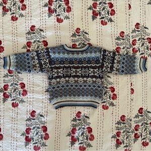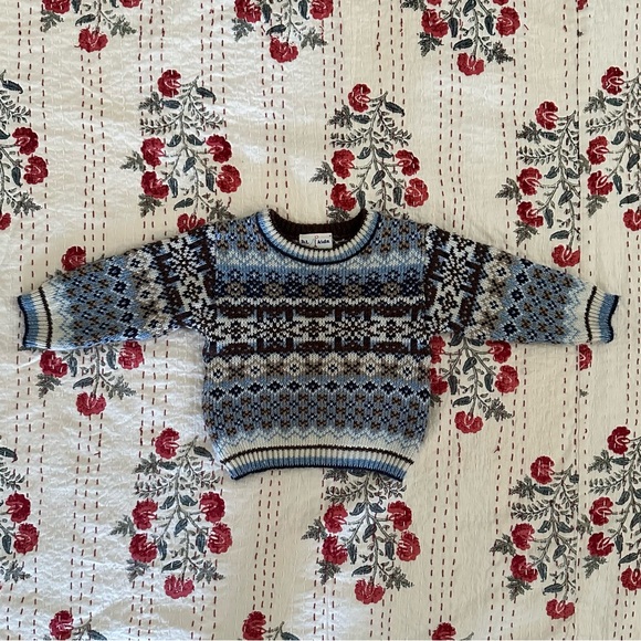 Stylish sweater with intricate blue and black patterns. Perfect for cozy days. Runs a bit small. My baby wore at 6 months. Looks so cute oversized