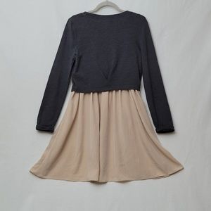 TAN W/GRAY SWEATER DRESS. TAG WAS CUT OFF, SO UNABLE TO IDENTIFY THE DESIGNER. MATERIAL IS VERY SOFT AND LOOKS VERY NICE. LONG 30" SLEEVES.