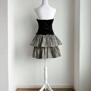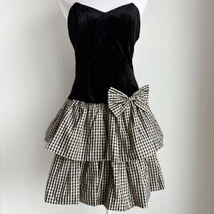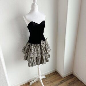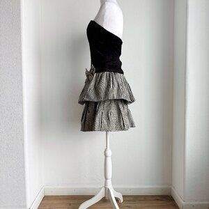 Vintage dress with black velvet sweetheart neckline and checkered bubble skirt in black, white, and gold