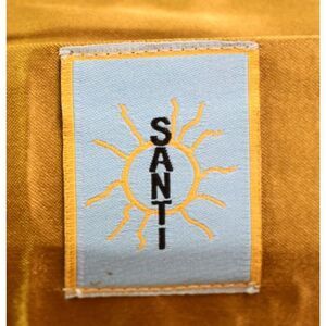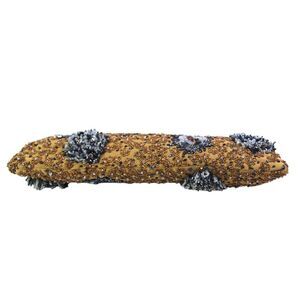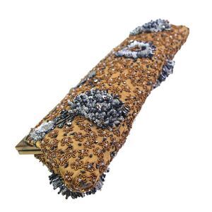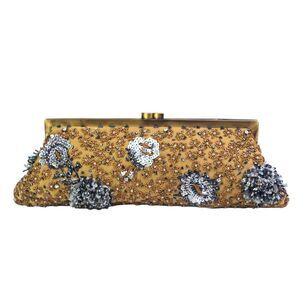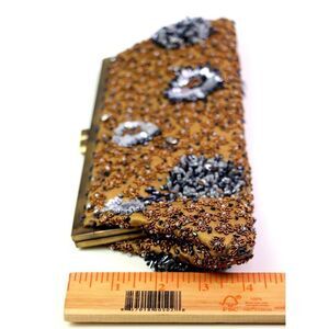 VINTAGE Santi BROWN GOLD CANVAS BEADED BEIGE BLUE WHITE FRAME KISS LOCK MEDIUM CLUTCH